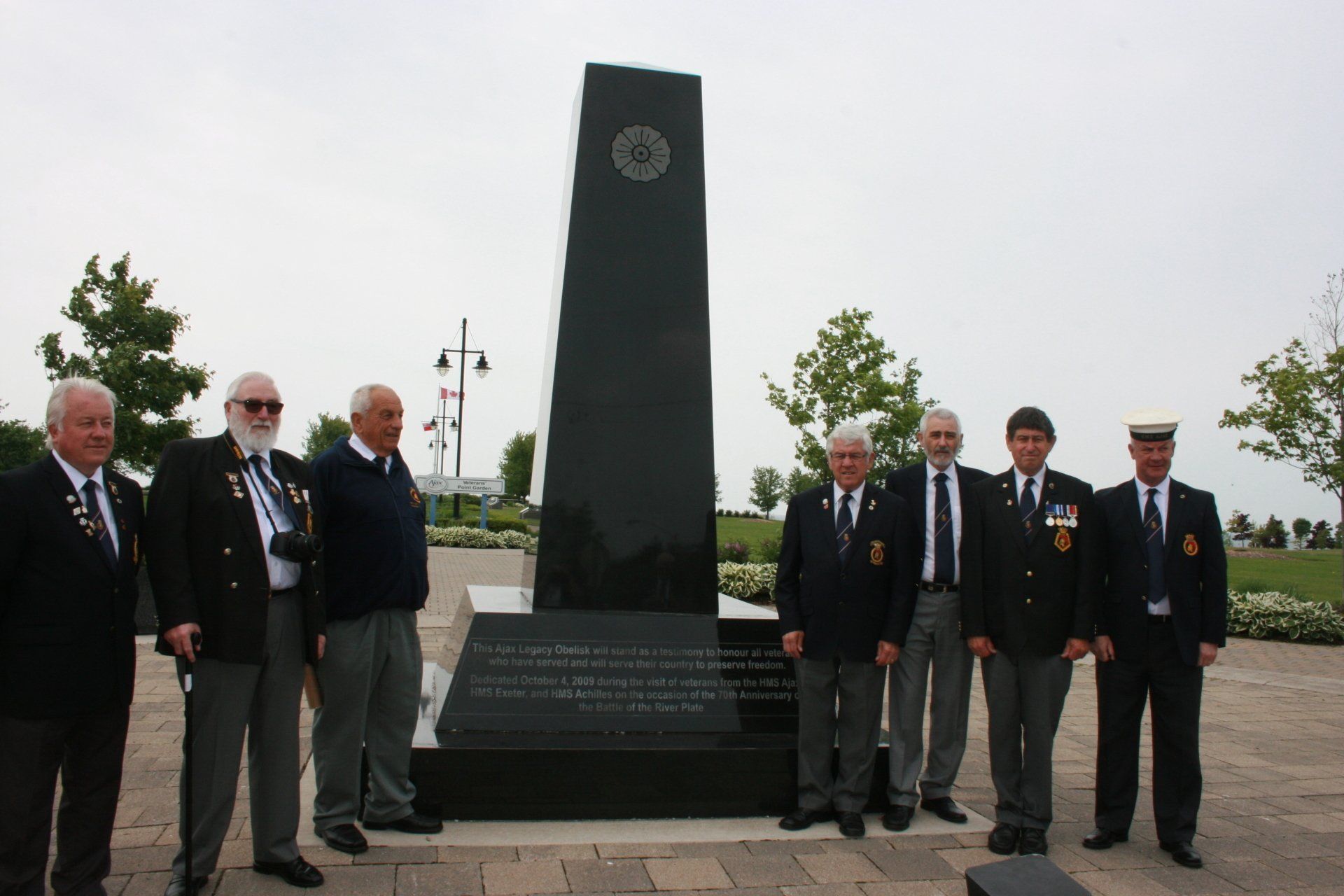 In October 1999 the 60th Anniversary of the Battle of the River Plate was marked in Ajax with the veterans' association's annual reunion. Many activities were held during the week, including dedication of the Harwood Point Historical Garden, a flypast of a Canadian Forces plane, tree planting ceremonies, and a parade. The town had a total of 65 visitors, including 12 veterans who served on HMS Ajax at the Battle in December 1939. There were also crew members from the Achilles and Exeter, along with family members and other representatives. The 70th Anniversary of the Battle of the River Plate was celebrated in October 2009. Notable events included dedication of a memorial Obelisk at Veteran’s Point, gala dinner & dance, Toronto Harbour boat cruise and historical town bus tour.