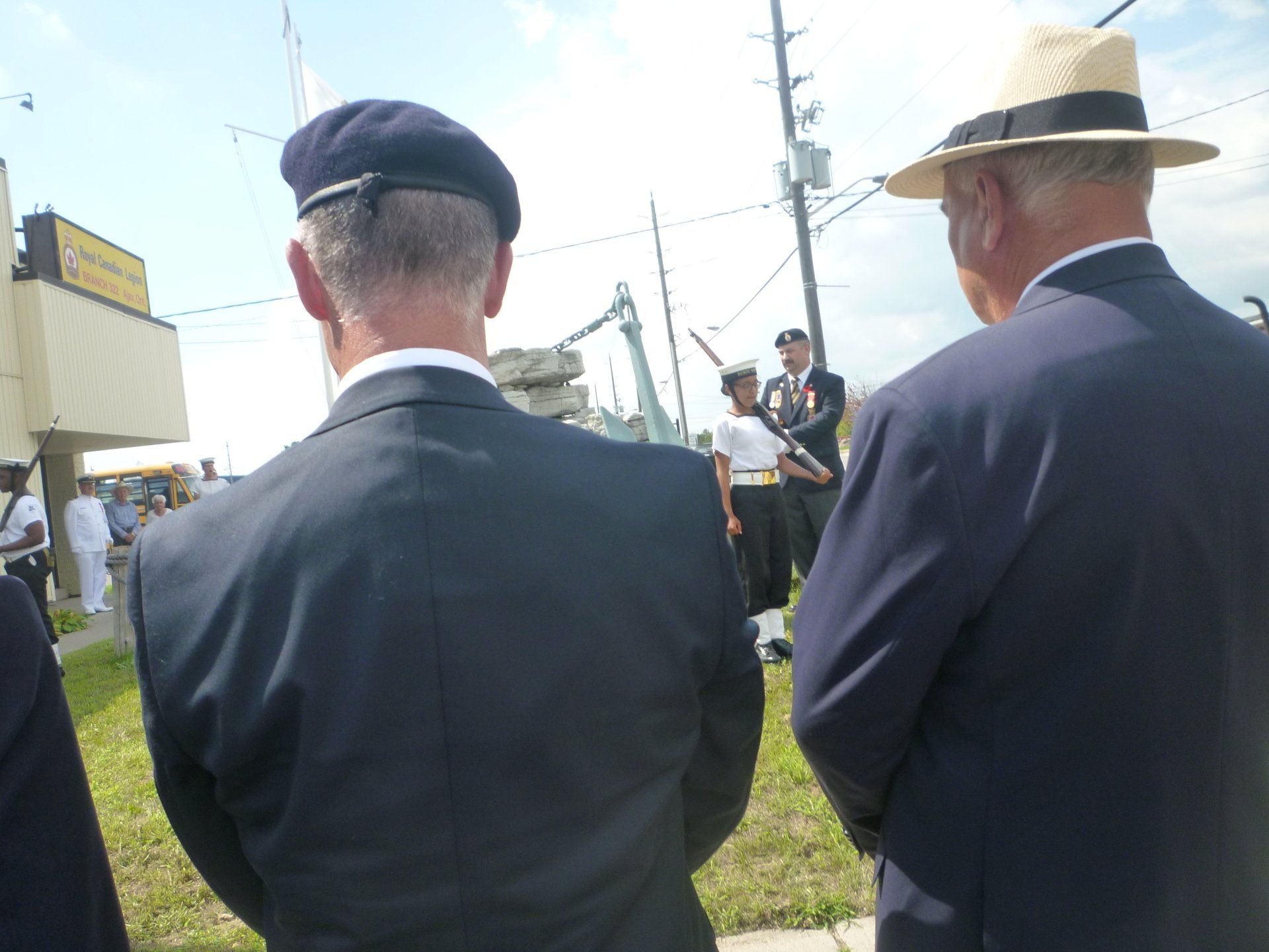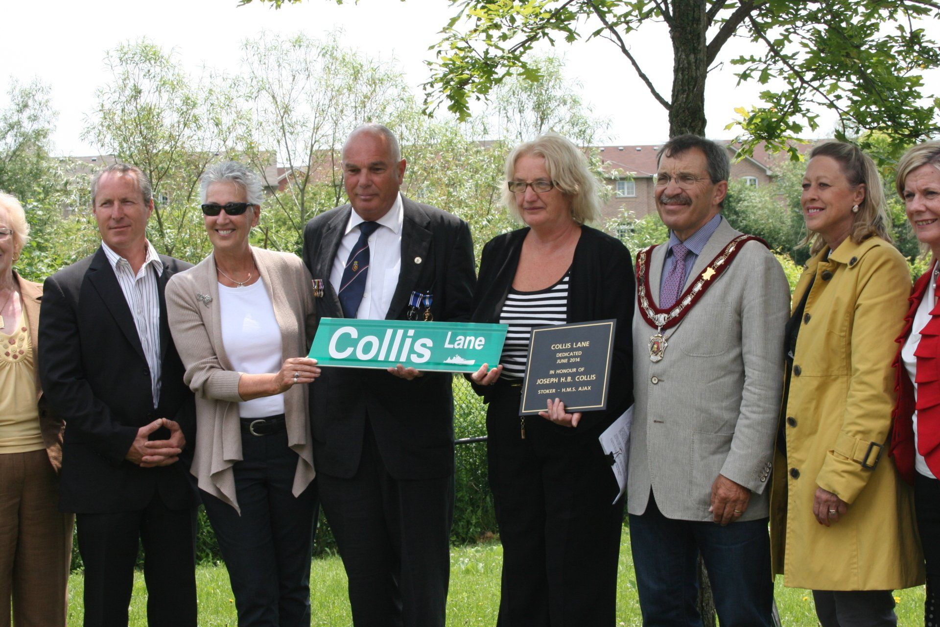 When you look at a street sign in Ajax, you are looking at history: most of our streets have been named after the officers and men that served on the HMS Ajax Cruiser before, during and after the war and at the Battle of the River Plate . The street names include Exeter Road named after HMS Exeter and Achilles Road named after HMS Achilles. Harwood Avenue is named for Admiral Henry Harwood, commander of the Ajax. Occasionally members of the crew of HMS Ajax or their families visit our Town to see the streets named after them. On such occasions a tree planting is done, and a plaque is placed at the foot of the tree. The visitor is presented with a street sign bearing his name. We have had several significant events to mark our link with the HMS Ajax and World War II: Ship’s Visit. A tradition dating from 1963 has each incoming Mayor extend an invitation for the HMS Ajax to visit. The tradition started when then-mayor William Parish visited Birkenhead, England to attend the commissioning of the eighth Royal Navy vessel to carry the name Ajax. (The seventh vessel was the one involved in the Battle of River Plate). The invitation could not be accepted until a few years later when it was extended by Mayor Clark Mason. The HMS Ajax docked at Oshawa on August 25, 1976. The crew was given "Freedom of the Town," the highest honour that can be bestowed on a visiting military unit. The crew paraded down Harwood Ave with swords raised, bayonets fixed, and colours flying.