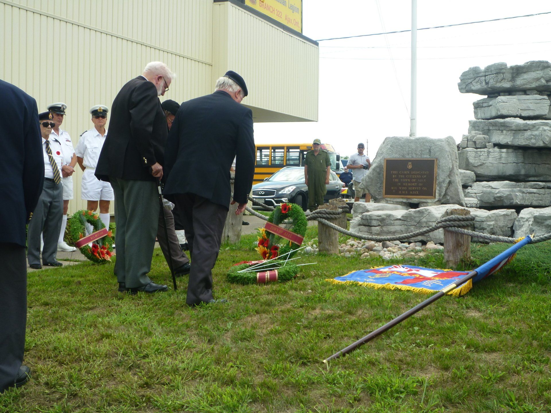 The anchor from the retired ship was brought to Canada on the HMS Fife in 1987, and was presented to then-Mayor Bill McLean. It rests in front of the Royal Canadian Legion, Branch 322 on Hunt Street. It is a memorial to Canadians who died serving overseas, and to those who served on ships named HMS Ajax. Several hundred veterans and residents attended the dedication ceremony, which was broadcast to England by special trans-Atlantic hook-up.
